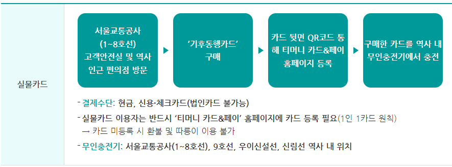 - 모바일 카드 이용 시 주의사항: 모바일 기후동행카드는 스마트폰에 등록된 카드만 사용 가능하므로, 스마트폰을 분실하지 않도록 주의해야 합니다.