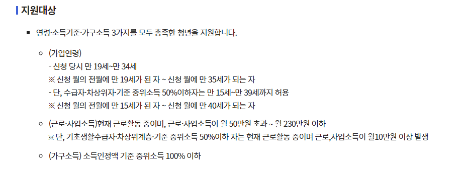 - 기타 조건: 신청자는 근로 중이어야 하며, 근로소득이 일정 수준을 넘어야 합니다. 근로를 통해 소득을 창출하고 있는 청년만이 이 프로그램의 대상이 될 수 있습니다.